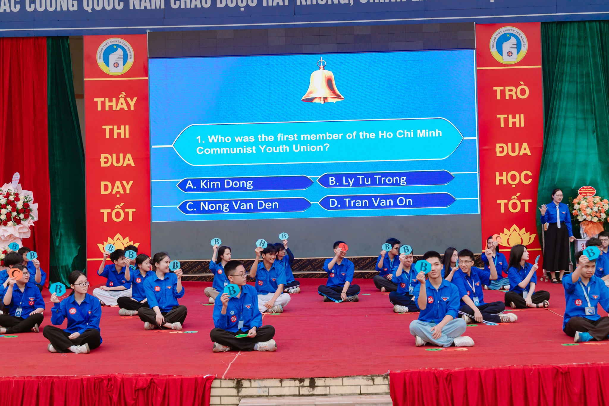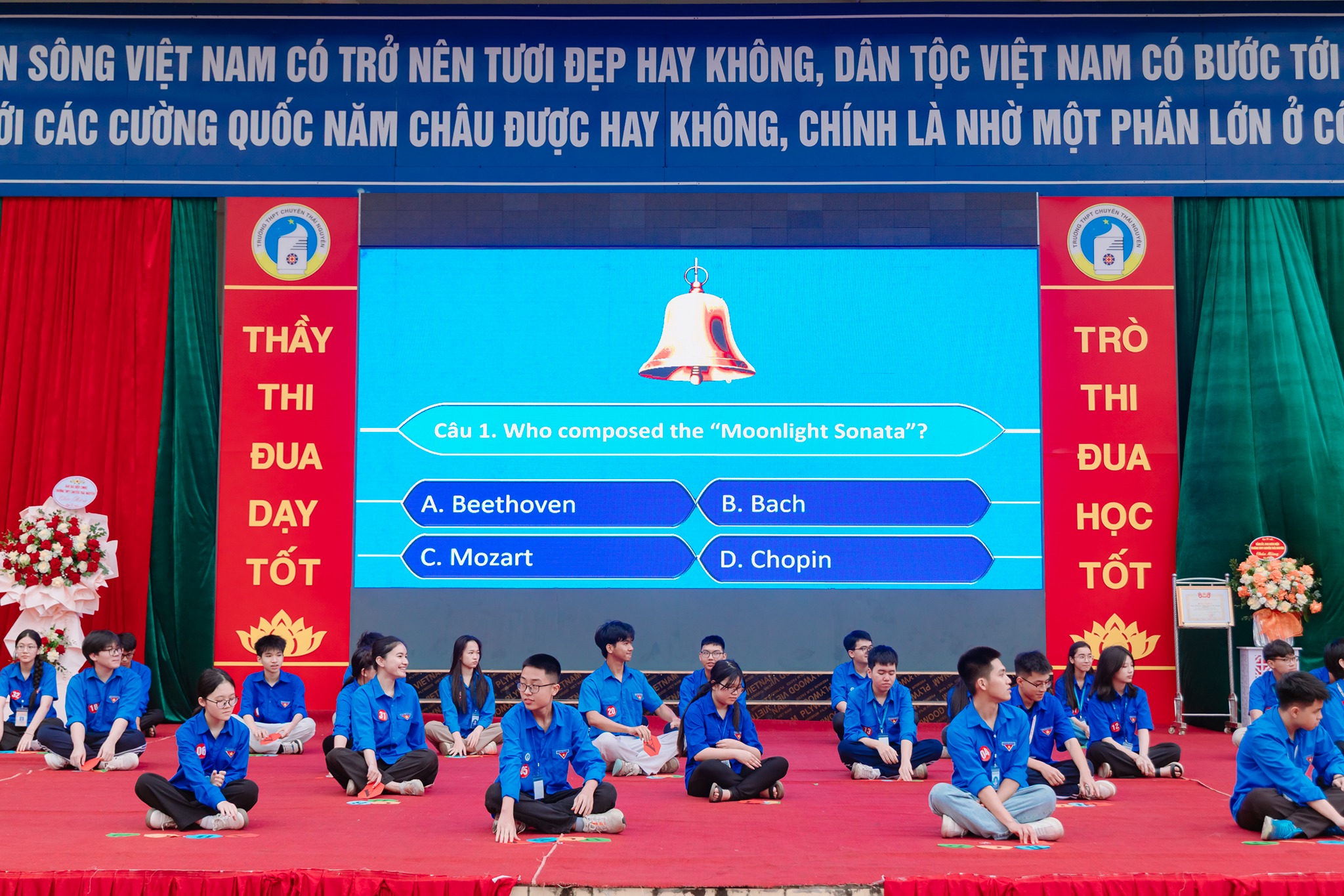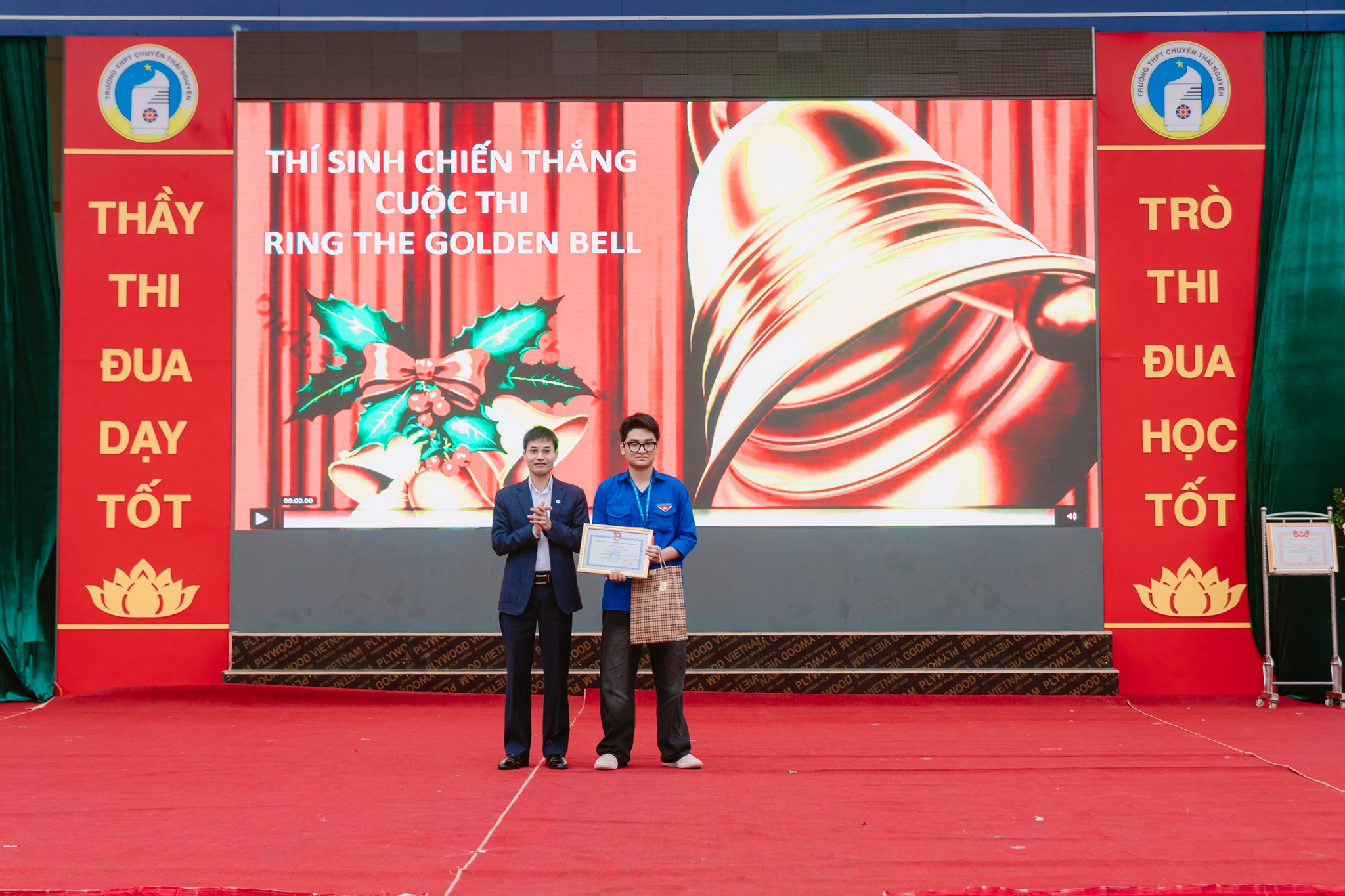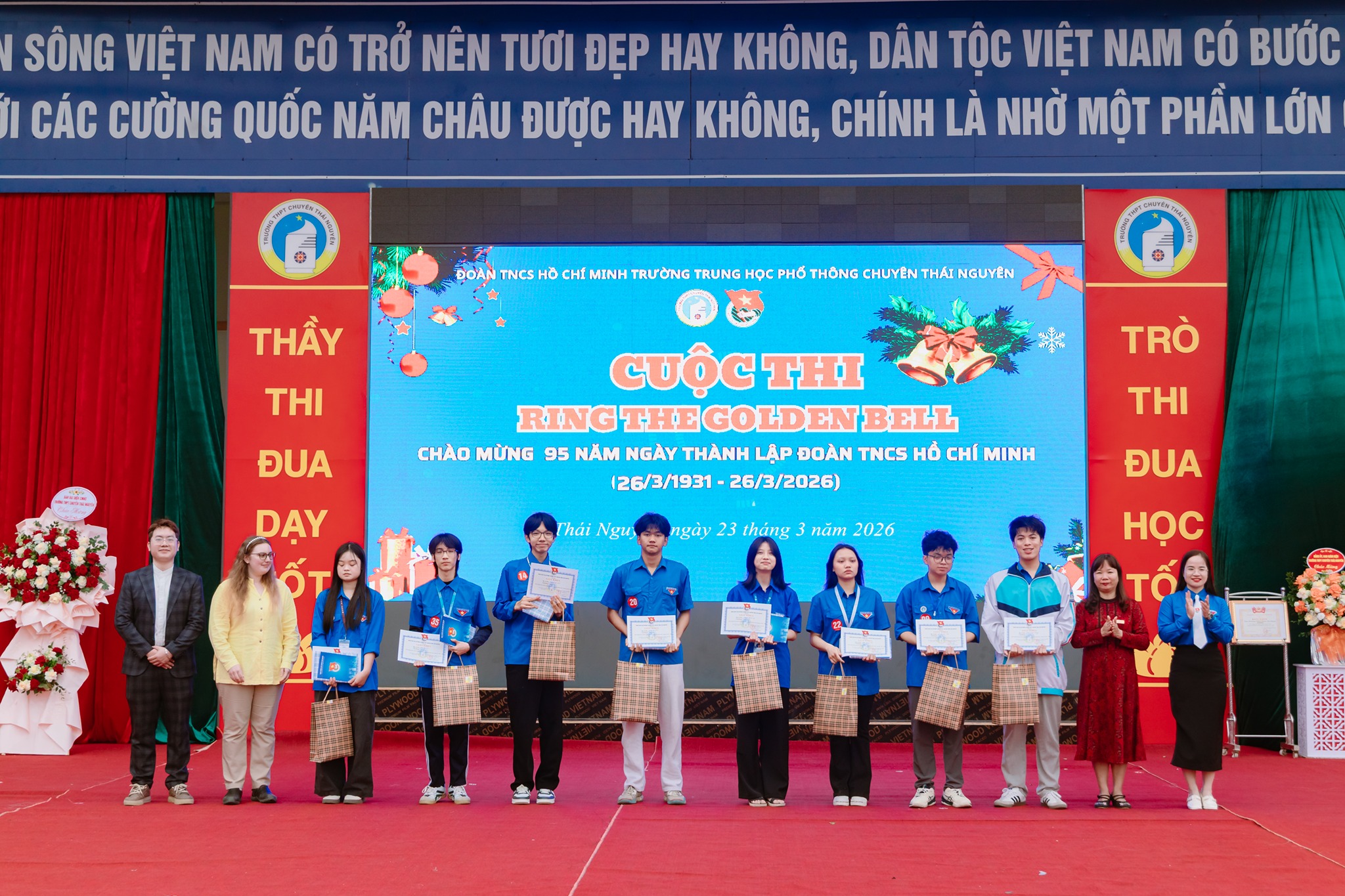 Nằm trong khuôn khổ chương trình chào mừng kỷ niệm 95 năm ngày thành lập Đoàn TNCS Hồ Chí Minh (26/03/1931 – 26/03/2026), cuộc thi “Ring The golden bell” năm 2026 chính thức được khởi động lại cùng với sự phối hợp của Trung tâm Anh ngữ IELTS Mentor. Đây là sân chơi tiếng Anh dành cho học sinh xuất sắc đại diện các chi đoàn học sinh. Cuộc thi đã tạo nên không khí thi đua sôi nổi, góp phần nâng cao năng lực ngoại ngữ và phát triển toàn diện cho học sinh. Với nội dung thi các kiến thức về Đoàn TNCS Hồ Chí Minh, văn hóa, xã hội, khoa học tự nhiên, tư duy và hiểu biết thực tiễn gồm 25 câu hỏi trắc nghiệm qua 2 vòng thi. Thí sinh trả lời đúng tiếp tục, sai bị loại; thí sinh cuối cùng là người chiến thắng Sau nhiều vòng thi hấp dẫn, kết quả chung cuộc được ghi nhận như sau * Giải Nhất (Thí sinh rung chuông vàng): Ngô Minh Quang - Sinh 12 * Top 10 thí sinh xuất sắc 1. Ngô Minh Quang - Sinh 12 2. Lưu Gia Bảo - Tin 12 3. Nguyễn Viết Linh - Trung 12 4. Đinh Bộ Lĩnh - Pháp 12 5. Vũ Sơn Tùng - Hoá 12 6. Đỗ Lý Anh Khôi - Nga 12 7. Chu Quỳnh Anh - Nga 11 8. Phạm Gia Khánh - Sinh 11 9. Nguyễn Thanh Mai - Anh 11A1 10. Nguyễn Xuân Cầm - Nga 10 Cuộc thi không chỉ giúp học sinh củng cố kiến thức về lịch sử Đoàn TNCS Hồ Chí Minh, các lĩnh vực Khoa học tự nhiên, Khoa học xã hội, tư duy, kiến thức xã hội mà còn truyền cảm hứng học tập, rèn luyện để trở thành những đoàn viên ưu tú. XEM QUYẾT ĐỊNH KHEN THƯỞNG TẠI ĐÂY !!! MỘT VÀI HÌNH ẢNH